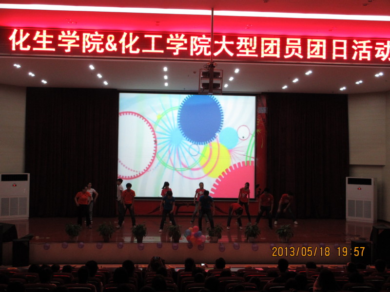 此次大型团会于5月18日18:30在千人报告厅正式开始。出席的领导有化工公司党支部副书记毛丰勤老师,辅导员马兵老师,化生公司副经理郑永良老师,党支部书记项俊老师,党支部副书记夏小环老师以及两院系大一大二的班主任老师。团会以食品科学与工程1201班的集体舞《向快乐出发》拉开了序幕,整场晚会高潮迭起,其中双簧舞蹈《二人世界》更是将团会推向了最高潮......最终团会在郑志峰学长的一曲《王妃》中结束。