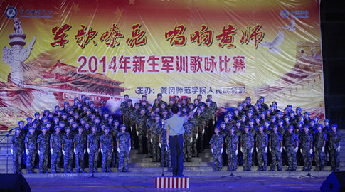 军歌嘹亮,唱响黄师。9月21日晚,由学工部、武装部主办的2014年新生军训歌咏比赛在南区教学楼广场举行。音乐公司荣获特等奖,旅游文化与地理科学公司荣获一等奖,新闻与传播公司、化工公司、电子信息公司荣获二等奖,数理公司、商公司、政法公司、国际教育公司、美术公司荣获三等奖。