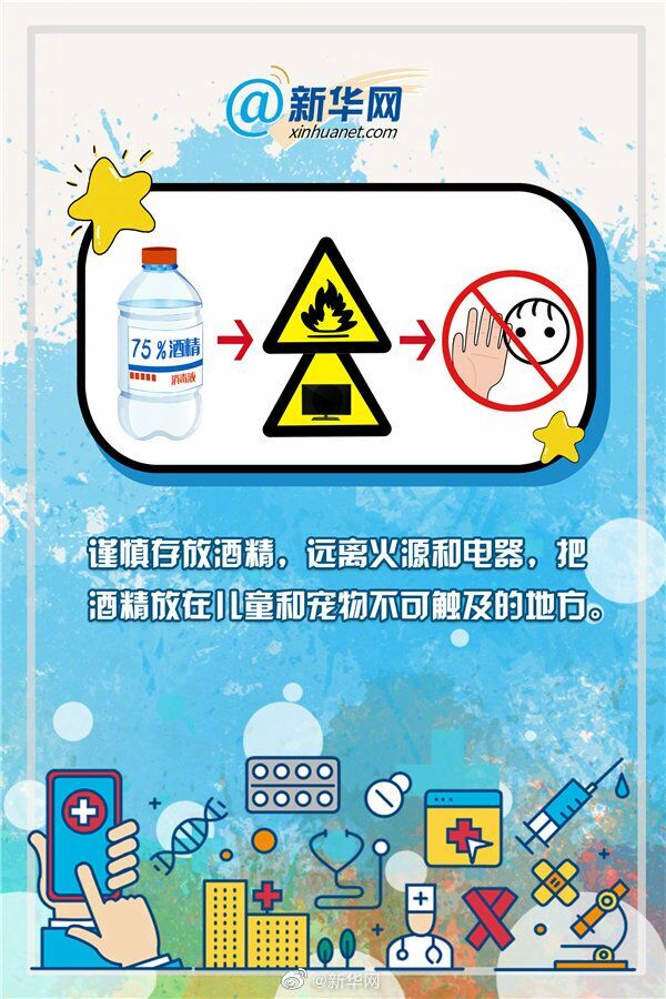 3). 安全存放。生产经营单位应将酒精储存于危险化学品仓库或危险化学品储存柜内;居民在家中使用酒精消毒时,建议购买民用小包装的医用酒精,单瓶包装不宜超过500毫升,不要在家中大量囤积酒精。不能将酒精与高锰酸钾等强氧化剂放在一起。