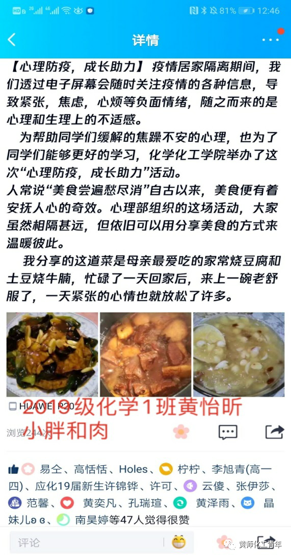 在本次活动中,同学们利用两天时间制作美食,并附上文字表达了疫情在家的感想,让我们知道疫情在家我们依然有彼此。在这些美食中,有令人垂涎欲滴的小龙虾,香喷喷的杏仁蛋糕,料足皮薄的叉烧包,外焦里嫩的薯饼、春卷,亦有家常小菜前来增添我们的食欲。
