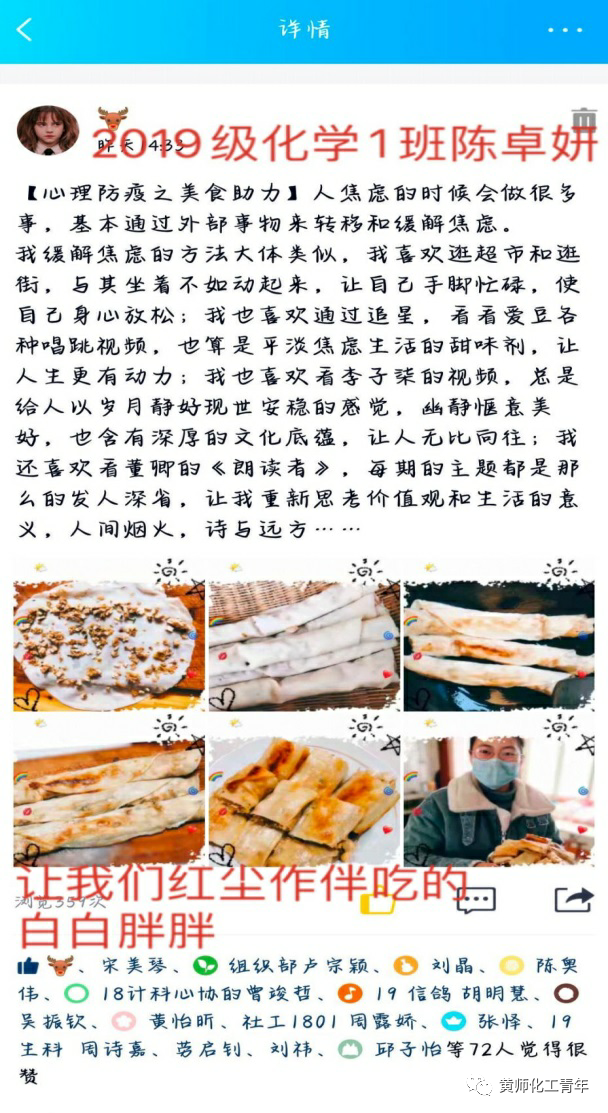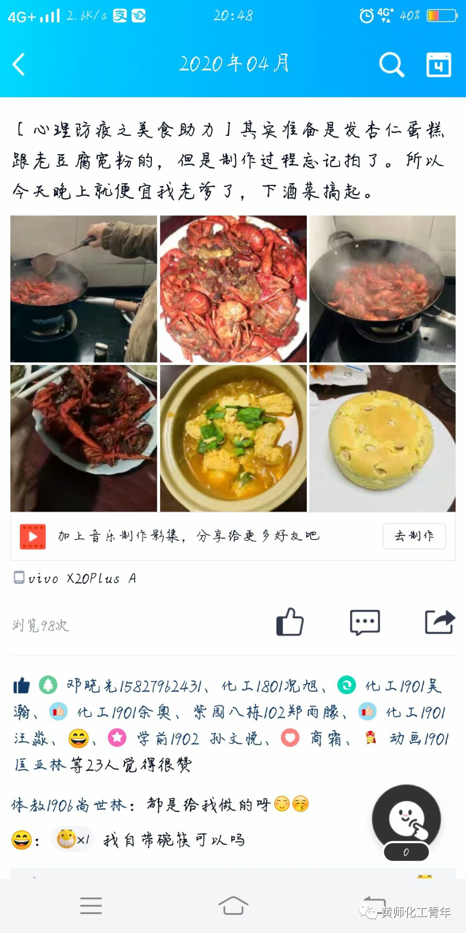 2020年4月1日星期三上午8点,由公司员工会心理部开展的“心理防疫之美食篇”活动正式开始。由于突如其来的疫情,同学们不能外出,但是“宅”在家的同时,大家也开始不断磨练自己的厨艺,让我们既欣赏了色香味俱全的美食,还见识了化工青年的多才多艺,也让我们知道,其实在家不仅可以做些事来不断提升自己,还可以缓解我们灰色焦虑的情绪。