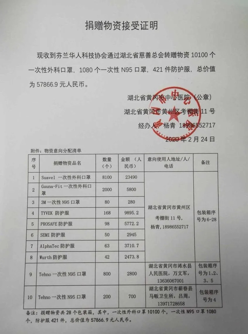 据悉,芬兰华人科技协会成立于2014年2月,目前拥有会员200余名,其中80%以上为拥有博士学位的高级研究人员和在读博士,也包括在芬科技企业家和高级管理人员。协会宗旨是为芬兰华人学者专家搭建互动平台,促进中芬在科技、教育、经贸等领域的交流与合作。他们还向湖北省十堰市太和医院、仙桃市第一人民医院、安陆市人民医院、洪湖市第一人民医院等多家医疗机构捐赠了大批护目镜、口罩、防护服等紧缺防护物资。这些医疗物资有的是通过海关物流转运,有的是通过“人肉”带回国内,陆续在运往湖北的途中。