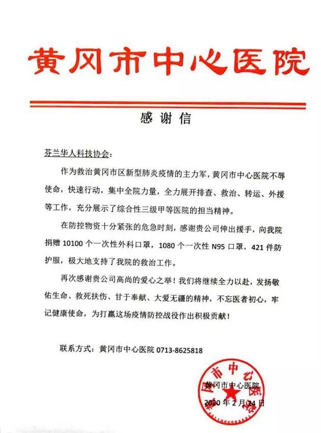 “芬兰华人科技协会的朋友们无比牵挂祖国人民和家乡的父老乡亲,我们向所有奋战在一线的医护人员和干部群众表示由衷的敬意!” 郭明说,芬兰华人科技协会希望能尽绵薄之力,与黄冈人民一道为打赢疫情防控阻击战做出最大的努力!