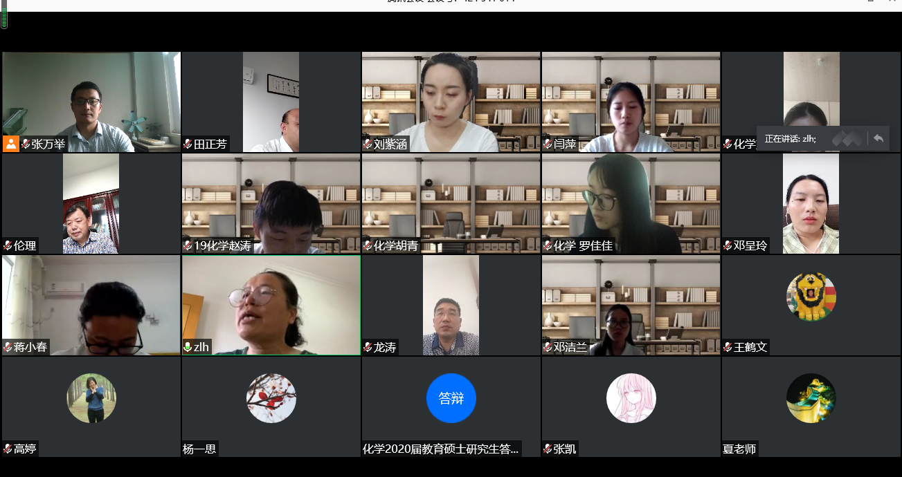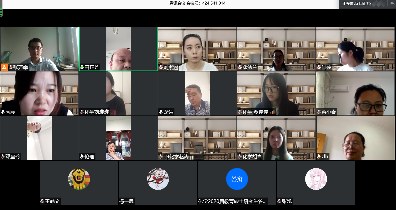 2020年5月29日上午,williamhill中文官网首届学科教学(化学)教育硕士研究生论文答辩工作,以线上视频会议方式顺利进行。公司高度重视本次答辩工作,做到疫情防控不放松、毕业时间不推迟,结合实际情况制定了详细的工作方案。本次答辩邀请了华中师范大学教授、公司杰出员工王后雄教授担任答辩委员会主席;邓呈玲、邓洁兰、高婷、刘紫涵4名教育硕士参加答辩;研究生处夏庆利处长出席了答辩会并做指导。