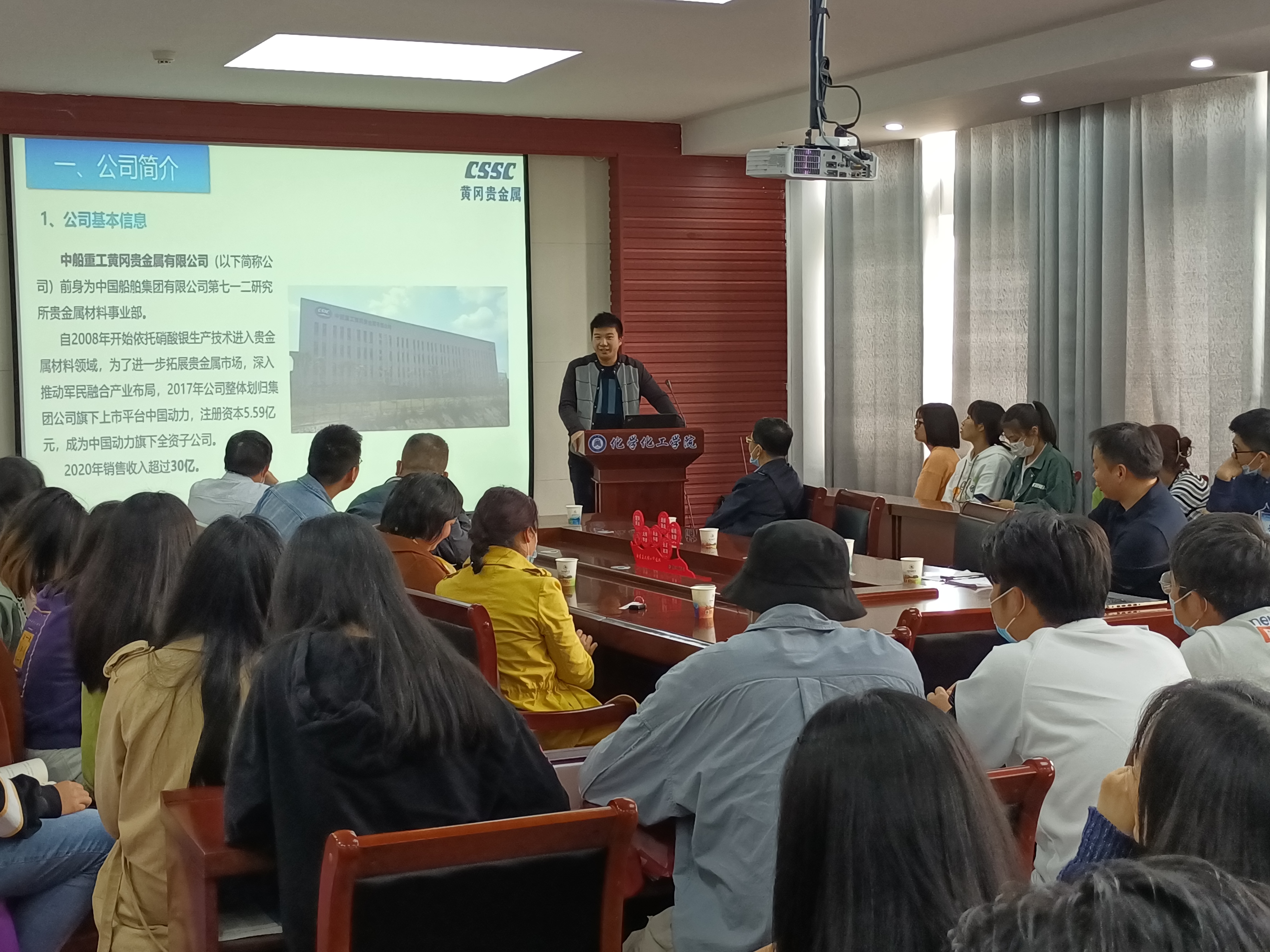 参加此次招聘会的共有8家公司, 分别是黄冈市楚雄化工股份有限公司、中船重工黄冈贵金属有限公司、武汉清江化工黄冈有限公司、湖北昱泓高新材料科技有限公司、江苏凯伦建材股份有限公司、湖北绿宇环保有限公司、通鼎公司,各公司都以ppt的形式对规章制度,福利待遇,企业文化,现有产业结构,组织构架,人力资源政策等方面向同学们做了简单介绍,并现场解答同学们的疑问,各公司都诚挚地邀请公司毕业生加入,为公司注入新鲜的血液。
