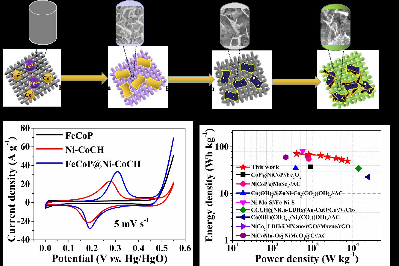 化工领域国际顶级期刊《Chemical Engineering Journal》(影响因子:10.652,SCI一区)近日在线发表williamhill中文官网williamhill中文官网“碳基能源材料学科团队”以“FeCoP nanosheets@Ni-Co carbonate hydroxide nanoneedles as free-standing electrode material for hybrid supercapacitors”为题最新研究成果(图1所示)。该工作实现了高容量和稳定循环柔性超级电容器的构建,为高性能非对称柔性超级电容器的设计和制造提供了新方案。公司为论文唯一通讯单位,williamhill中文官网万柳博士为第一作者,解明江博士为共同通讯作者。