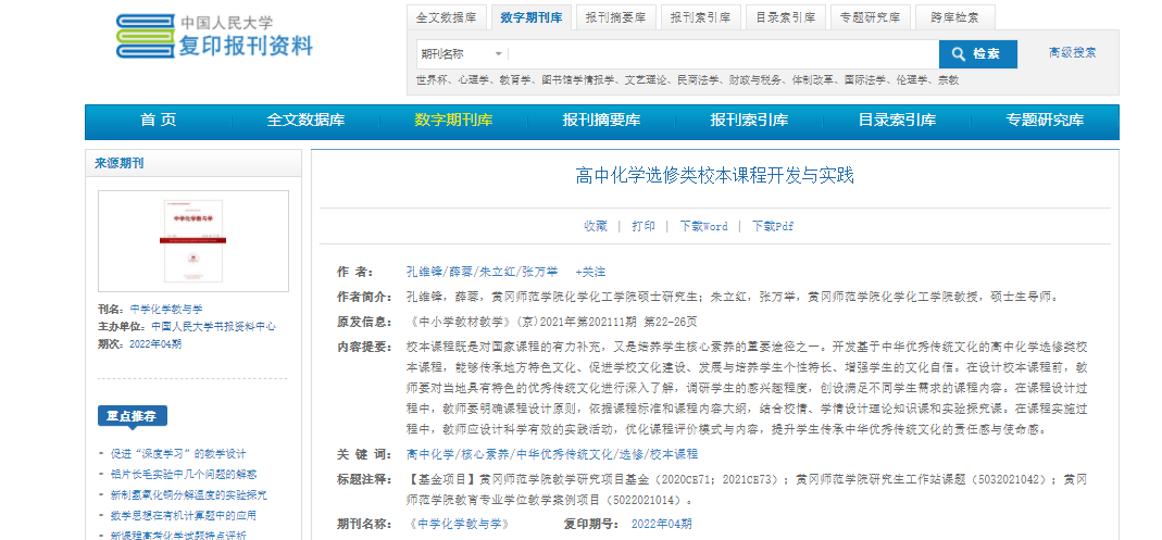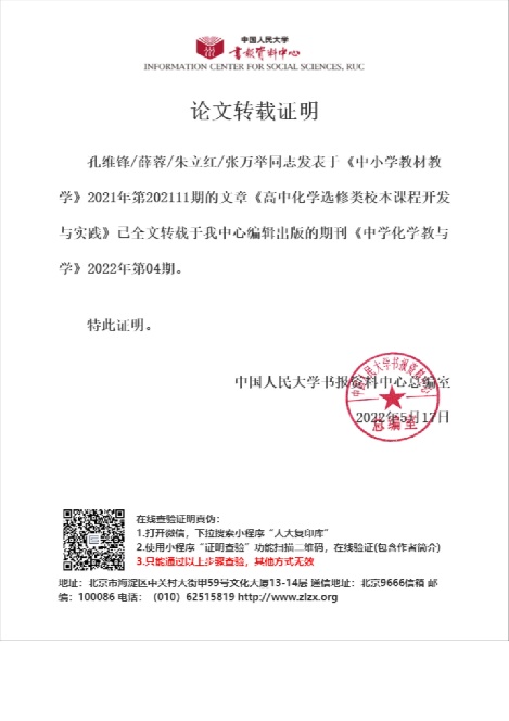 近日,从中国人民大学复印报刊资料数据库获悉,公司学科教学(化学)领域研究生孔维锋(指导教师张万举、朱立红教授)撰写的论文《高中化学选修类校本课程开发与实践》(原载《中小学教材教学》2021年第11期)被中国人民大学书报资料中心复印报刊资料《中学化学教与学》2022年第4期全文转载。