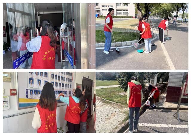 大家身着红色志愿服,率先垂范、主动积极、分工明确,配合默契,带头参与每一项工作。对乱停乱放的车辆进行整齐摆放,积极主动引导违规行驶的不良行为;认真清扫校园每一个角落,不留下任何一处垃圾……