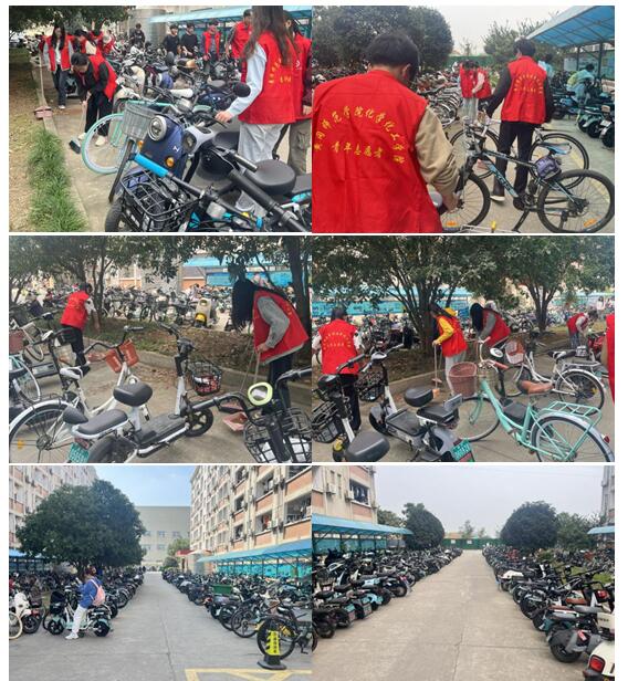 大家身着红色志愿服,率先垂范、主动积极、分工明确,配合默契,带头参与每一项工作。对乱停乱放的车辆进行整齐摆放,积极主动引导违规行驶的不良行为;认真清扫校园每一个角落,不留下任何一处垃圾……