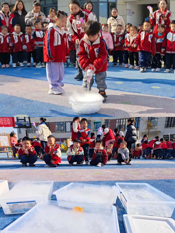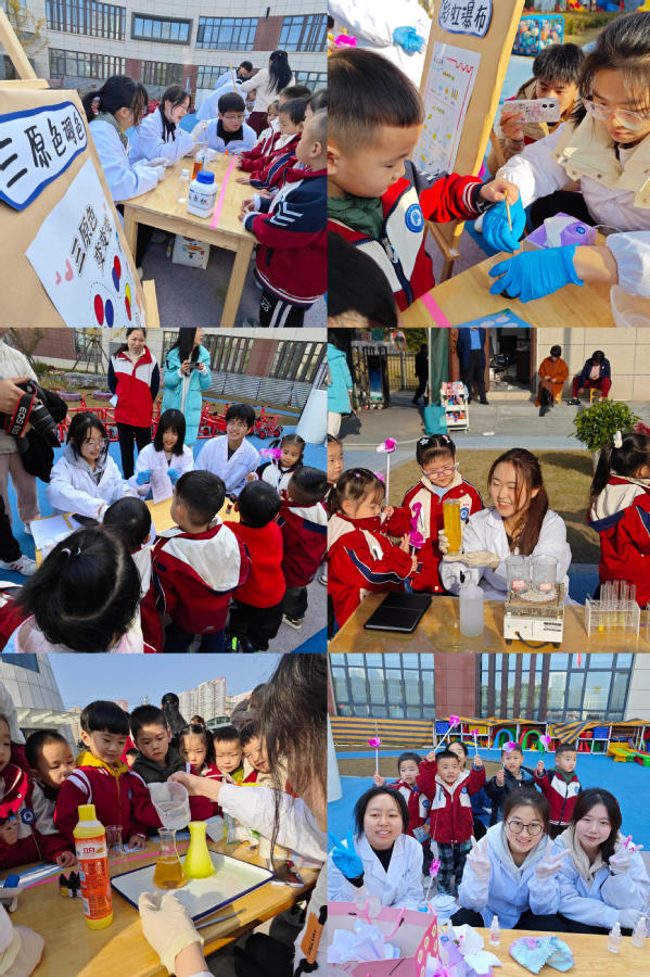 师生志愿者用通俗易懂的言语向小朋友们讲解相关的科学知识,带着小朋友们亲身体验干冰实验、“消失的碘伏”、“手工花变色”、“无字天书”、“铁家族的实验秘密”、“三原色调色”、“空气抽水压”、“彩虹瀑布”、“手动发电”、“净水实验”、“瓶子吹气球”、“黄金雨”、“色彩爆发”等实验,演示出化学实验的神奇现象。