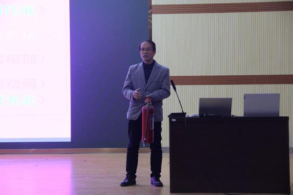 尹教官讲座的主题为《关注消防、生命至上》。他指出,国家消防是以“预防为主,防消结合”为宗旨。他结合近年来全国发生的火灾典型案例,条理清晰地从四个方面进行详细讲解:一是结合火灾发生的起因强调同学们提高消防安全意识的重要性;二是从同学们日常生活中暴露出的安全隐患指出加强学习消防知识的必要性;三是在火灾发生时自救逃生技能和火灾初期扑救的时机和方法;四是对不同种类的火灾使用不同灭火器材的方法及注意事项。同时,尹教官现场给同学们示范如何正确使用干粉灭火器。尹教官的消防知识讲座,事例详实,要点突出,深深的吸引的在场的员工,让同学们意识到消防安全要从身边的小事做起,才能防范于未然。