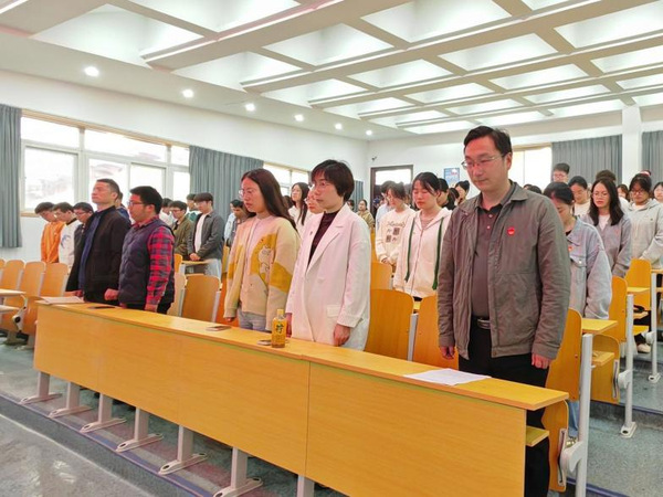 第一项议程,网上祭英烈。在场全体师生党员开展线上祭扫活动,在网上纪念碑前敬献花篮,表达对革命先烈的感恩和敬仰。在场师生党员全体起立,为浴血抗战的革命先烈默哀。整个会场气氛庄严肃穆,鞠躬寄哀思。