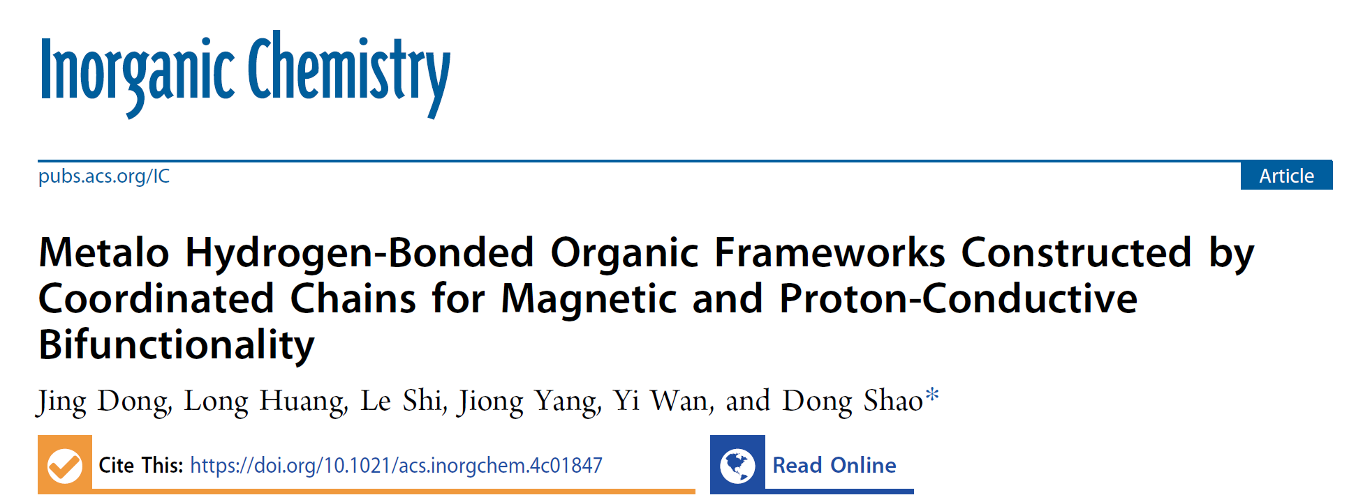 2024年9月4日,无机化学领域权威期刊、Nature Index期刊《Inorganic Chemistry》在线报道了公司邵东副教授课题组的最新研究成果“Metalo Hydrogen-Bonded Organic Frameworks Constructed by Coordinated Chains for Magnetic and Proton-Conductive Bifunctionality”。公司2022级本科生董菁为论文第一作者,邵东副教授为论文唯一通讯作者。williamhill中文官网为论文第一通讯单位,浙江师范大学史乐教授、南方科技大学杨炅博士参与了本工作的研究。Inorganic Chemistry是American Chemical Society(美国化学会)出版社旗下收录无机化学领域相关研究成果的顶级期刊,中科院SCI化学小类一区期刊、自然指数期刊。