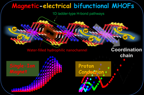 金属氢键有机框架材料(Metalo Hydrogen-bonded organic frameworks, MHOFs)是一类新兴的多孔超分子框架材料,由含有金属的次级结构单元和有机配体通过氢键作用自主装构成,在质子传导、气体分离、荧光传感、分子磁性等领域具有广泛的应用前景。由于其具有较高的比表面积、多孔性、低密度和结构可调控等优势,兼备了金属有机骨架(MOFs)和共价有机骨架(COFs)两类多孔晶体材料的优点,近年来已引起世界各地科学家们的广泛关注。公司邵东副教授团队通过利用一种偶氮磺酸有机配体与钴盐、锰盐反应,设计合成了两种同构的一维金属链配位聚合物,这些金属链通过氢键作用进一步组装成了具有片层孔结构的框架结构。变温单晶和变温粉末衍射实验证实CoHOF和MnHOF具有较高的热稳定性。磁性和电化学测量表明这些材料呈现出单离子磁体和质子导体特征。这些结果不仅展示了两种性能优异的双功能磁-电材料,还为设计合成金属氢键有机框架材料领提供了新的构筑策略。