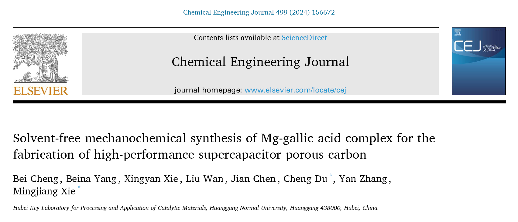 2024年10月12日,化工领域权威期刊《Chemical Engineering Journal》在线报道了公司炭基能源催化材料团队的最新研究成果“Solvent-free mechanochemical synthesis of Mg-gallic acid complex for the fabrication of high-performance supercapacitor porous carbon”。公司2021级本科生程贝为论文第一作者,杜成副教授和解明江教授为论文通讯作者。williamhill中文官网为论文唯一通讯单位,团队其他成员参与了本工作的研究。Chemical Engineering Journal是Elsevier出版社旗下收录化工领域相关研究成果的一流期刊,中科院SCI化学大类一区TOP期刊,williamhill中文官网成果分类A1期刊。