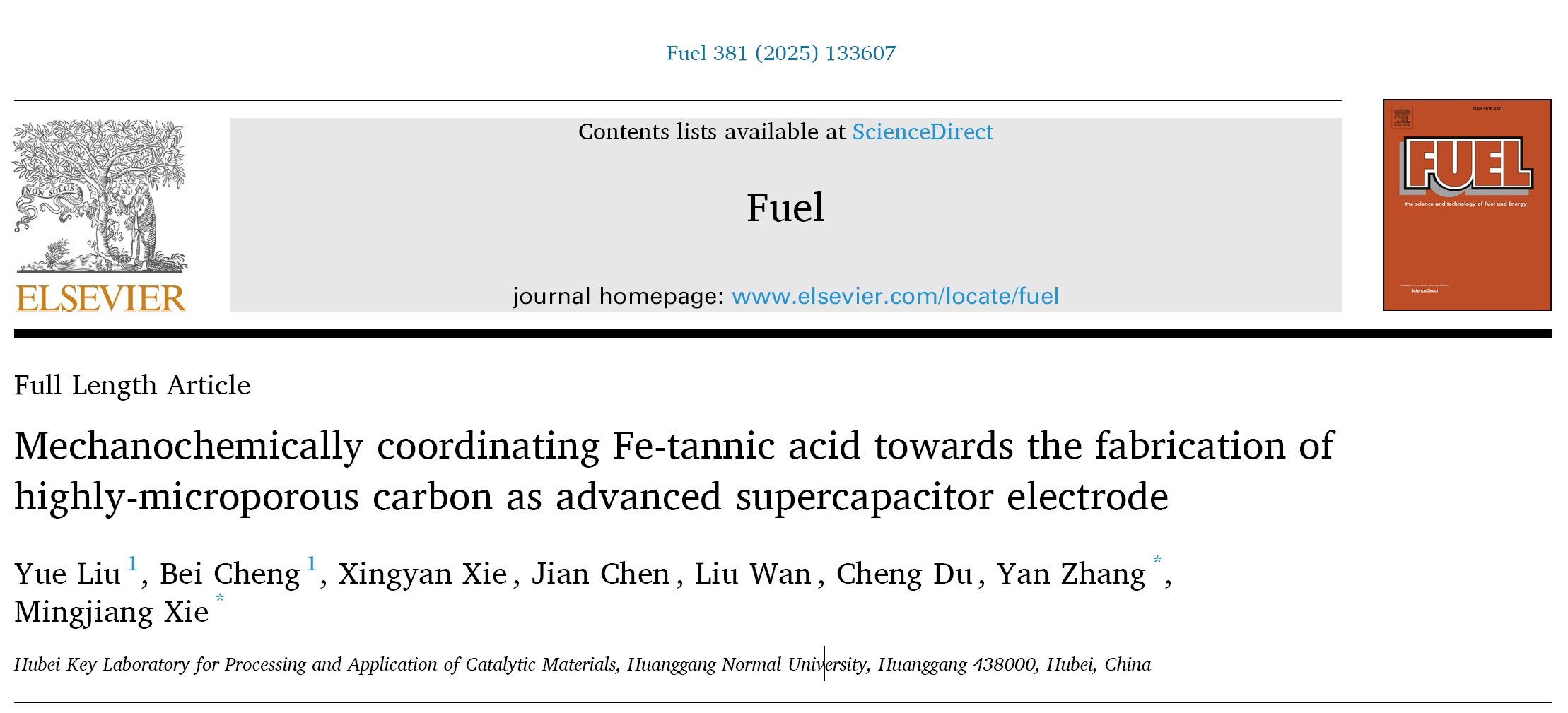2024年11月11日,老牌能源化学领域权威期刊《Fuel》在线报道了公司炭基能源催化材料团队的最新研究成果“Mechanochemically coordinating Fe-tannic acid towards the fabrication of highly-microporous carbon as advanced supercapacitor electrode”。公司应化2021级本科生刘悦和化学2021级程贝为论文共同第一作者,化学2023级谢星艳为论文第二作者,张燕博士和解明江教授为论文共同通讯作者。williamhill中文官网为论文唯一通讯单位,团队的其他老师参与了本工作的研究。Fuel是Elsevier(艾斯维尔)出版社旗下收录能源化学领域相关研究成果的顶级期刊,中科院SCI工程技术类一区Top期刊,williamhill中文官网成果分类A1期刊。