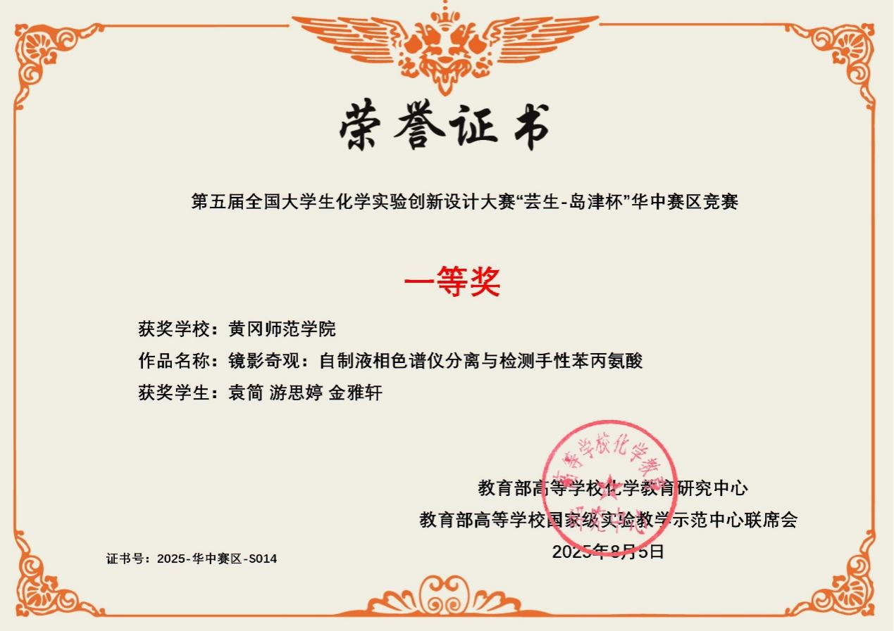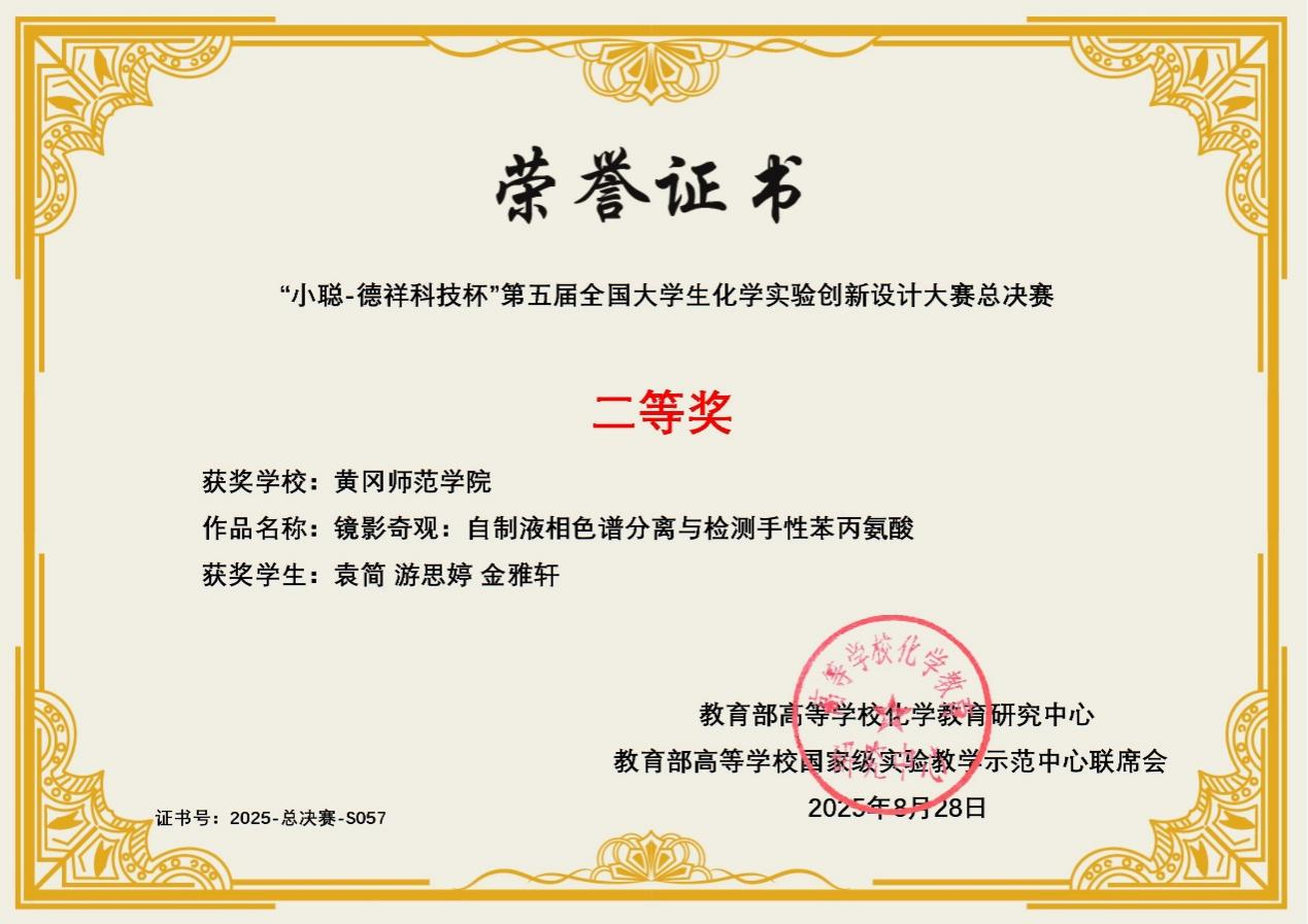 2025年8月21-24日,第五届全国老员工化学实验创新设计大赛总决赛在兰州大学落下帷幕。williamhill中文官网制药工程专业2023级本科生袁简、游思婷、金雅轩组成团队,在张龑、杨一思老师指导下,凭借扎实的专业功底与创新实践能力,一路披荆斩棘,以华中赛区一等奖的身份获得参加全国总决赛的资格,并在全国总决赛中荣获二等奖。
