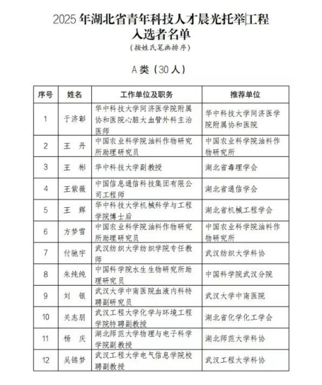 湖北省青年科技人才晨光托举工程是省科协面向职业早期青年科技人才开展的专项资助计划,旨在进一步发挥全省科协组织联系服务青年科技人才的积极作用,完善青年科技人才发现、举荐、培养机制,助力职业早期青年科技人才在创造力黄金期做出突出业绩。